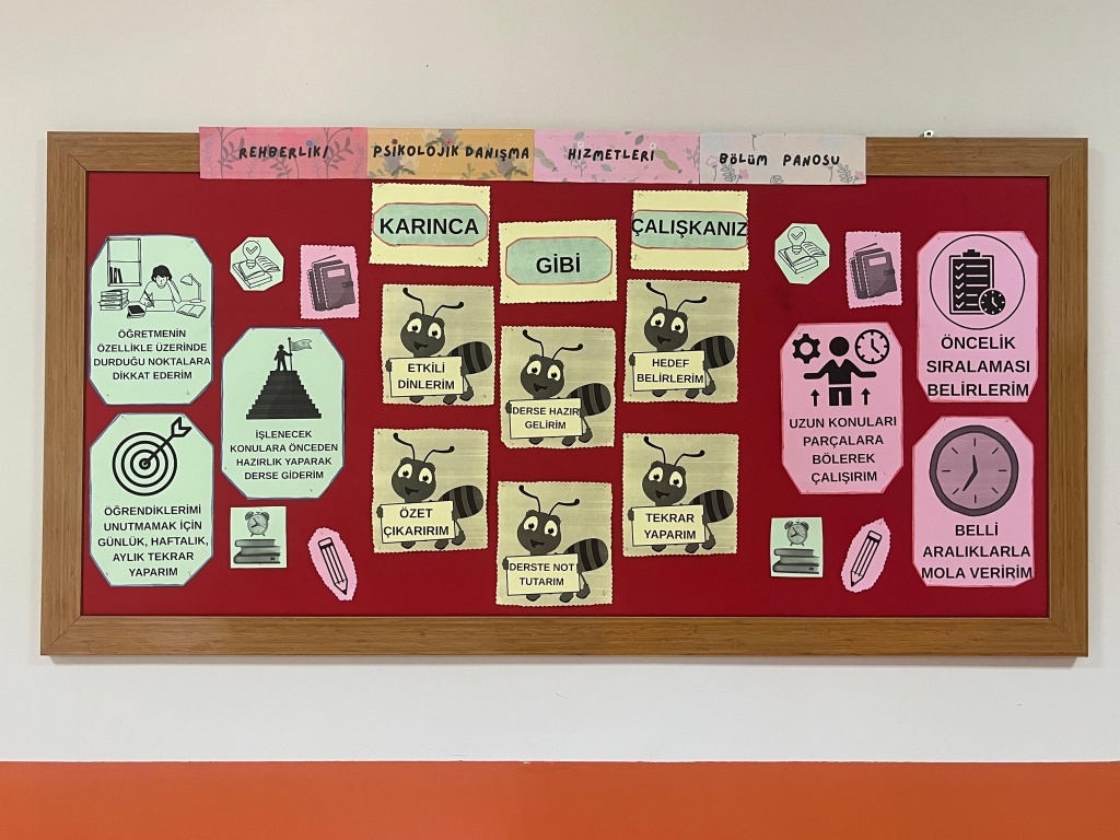 Patnos Rehberlik ve Araştırma Merkezi Rehberlik ve Psikolojik Danışma Hizmetleri Bölümü olarak 2025-2026 Eğitim ve Öğretim Yılı “Verimli Ders Çalışma” yerel hedefi kapsamında pano çalışması yapılmıştır.